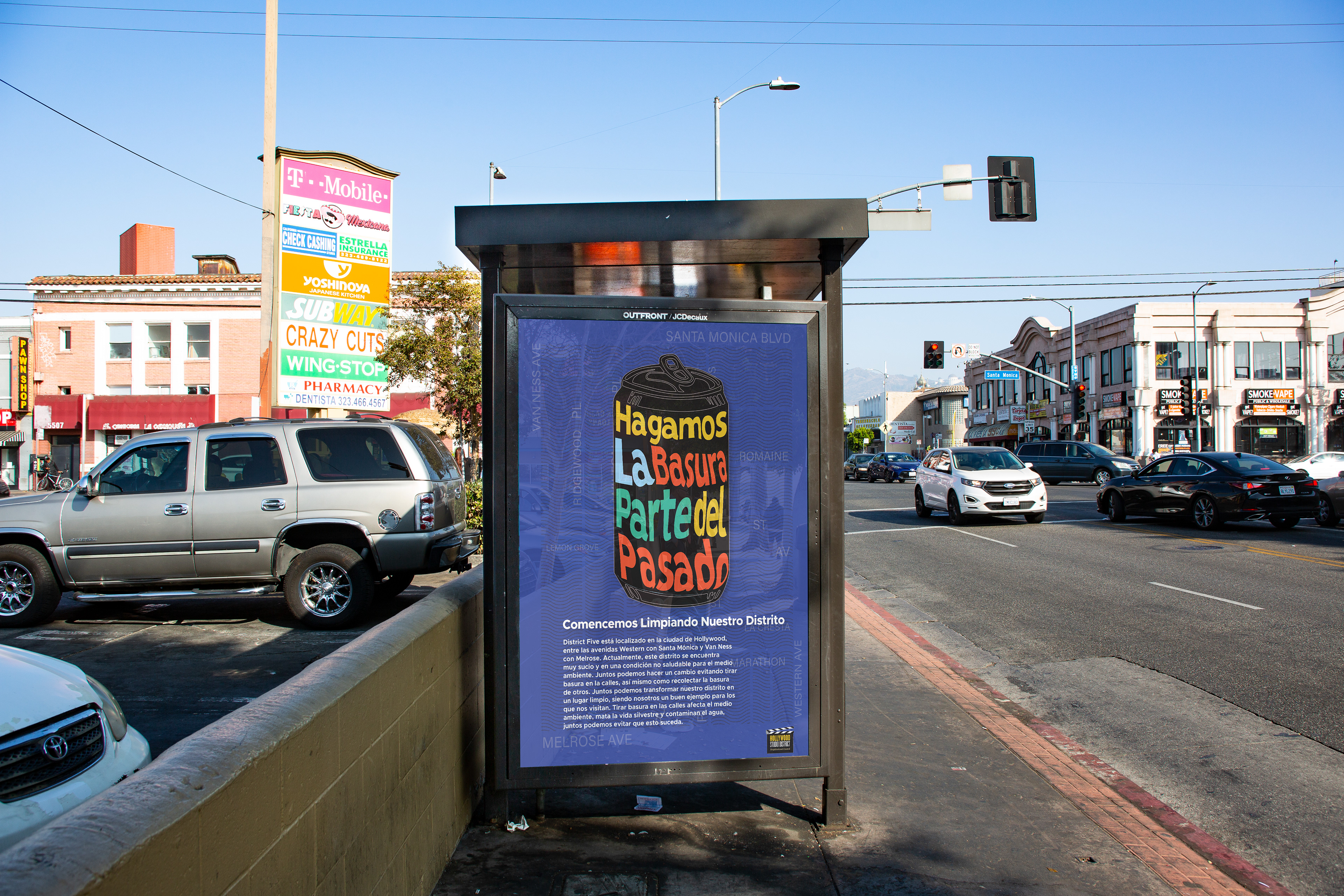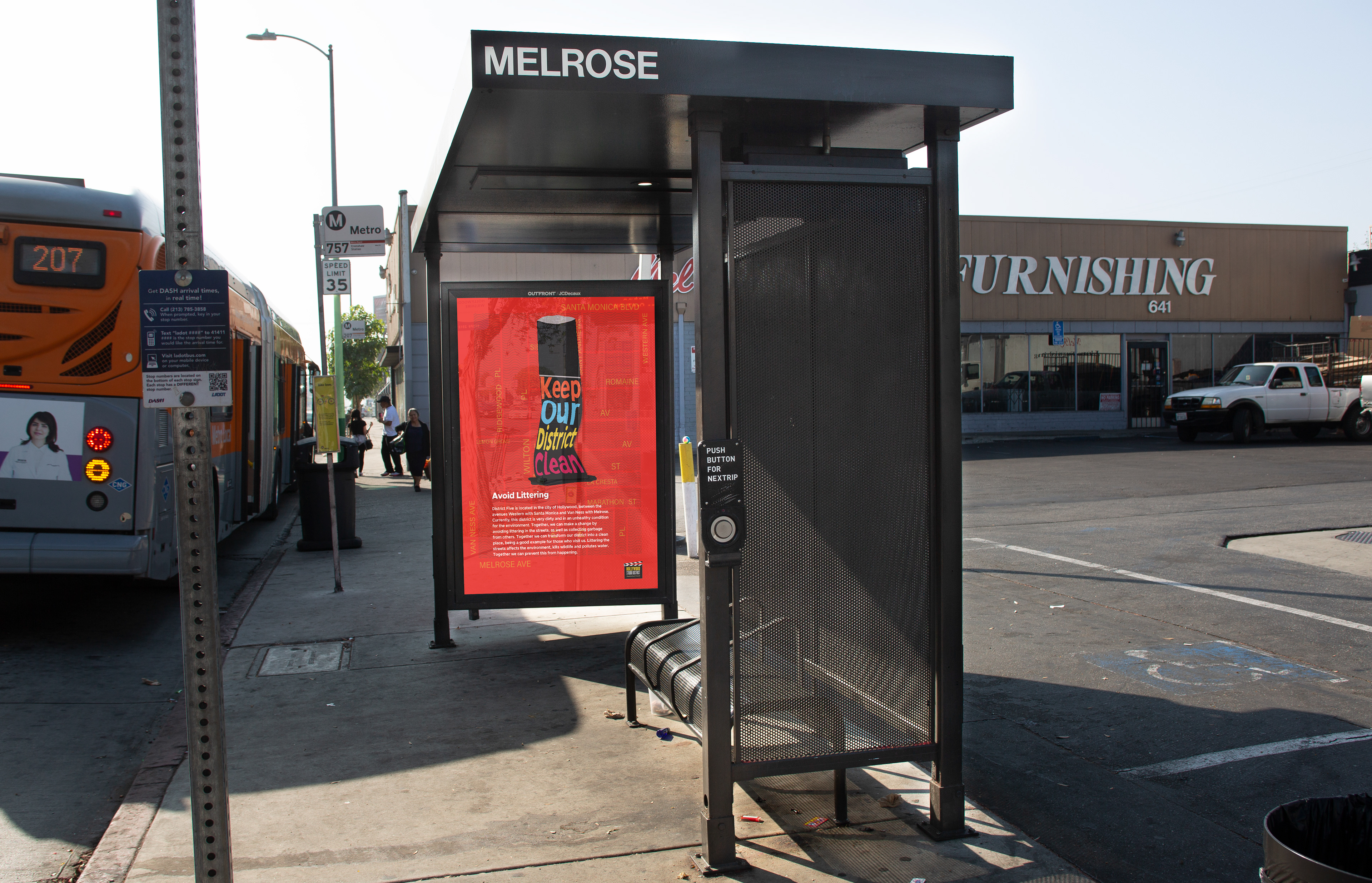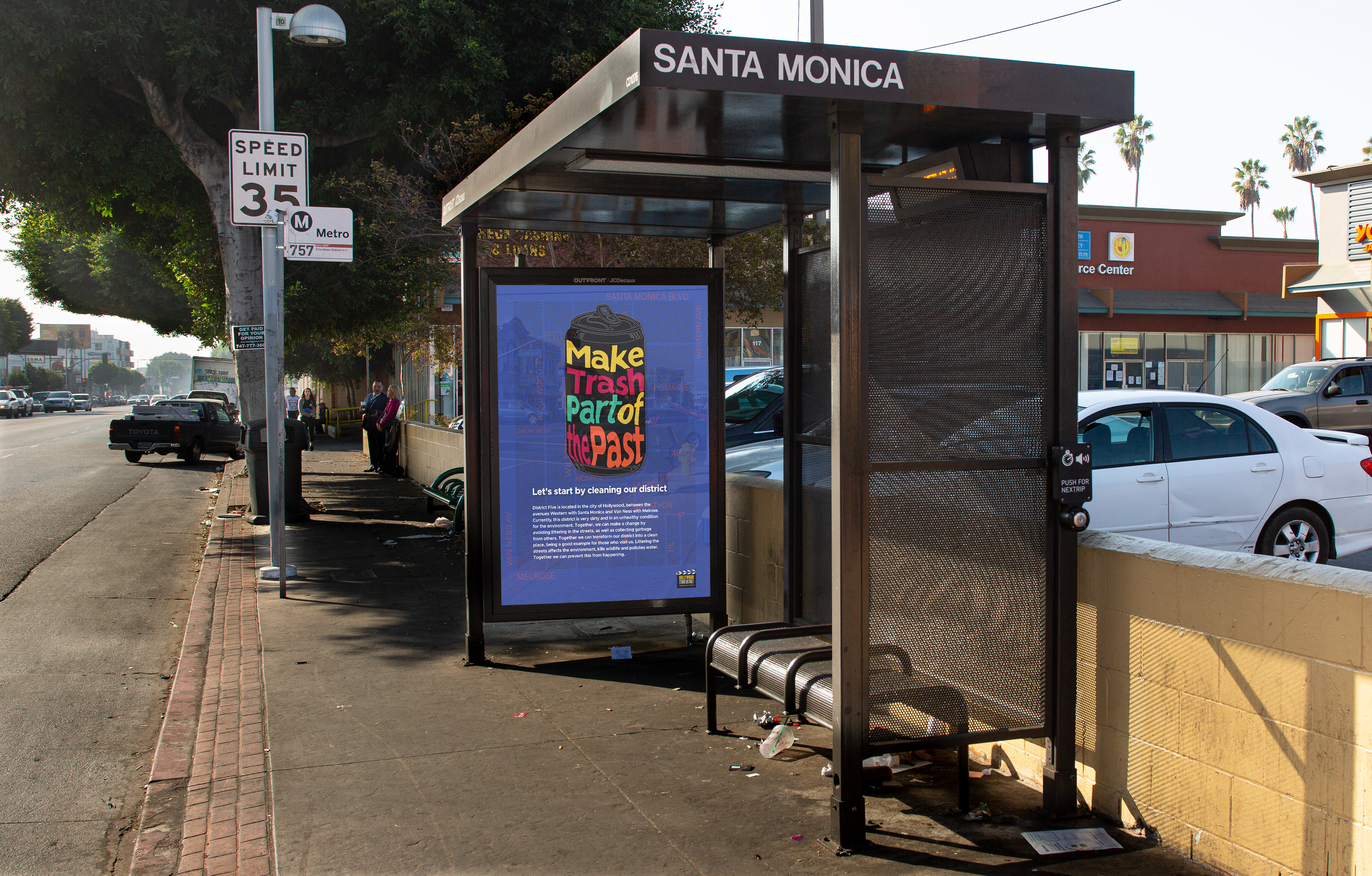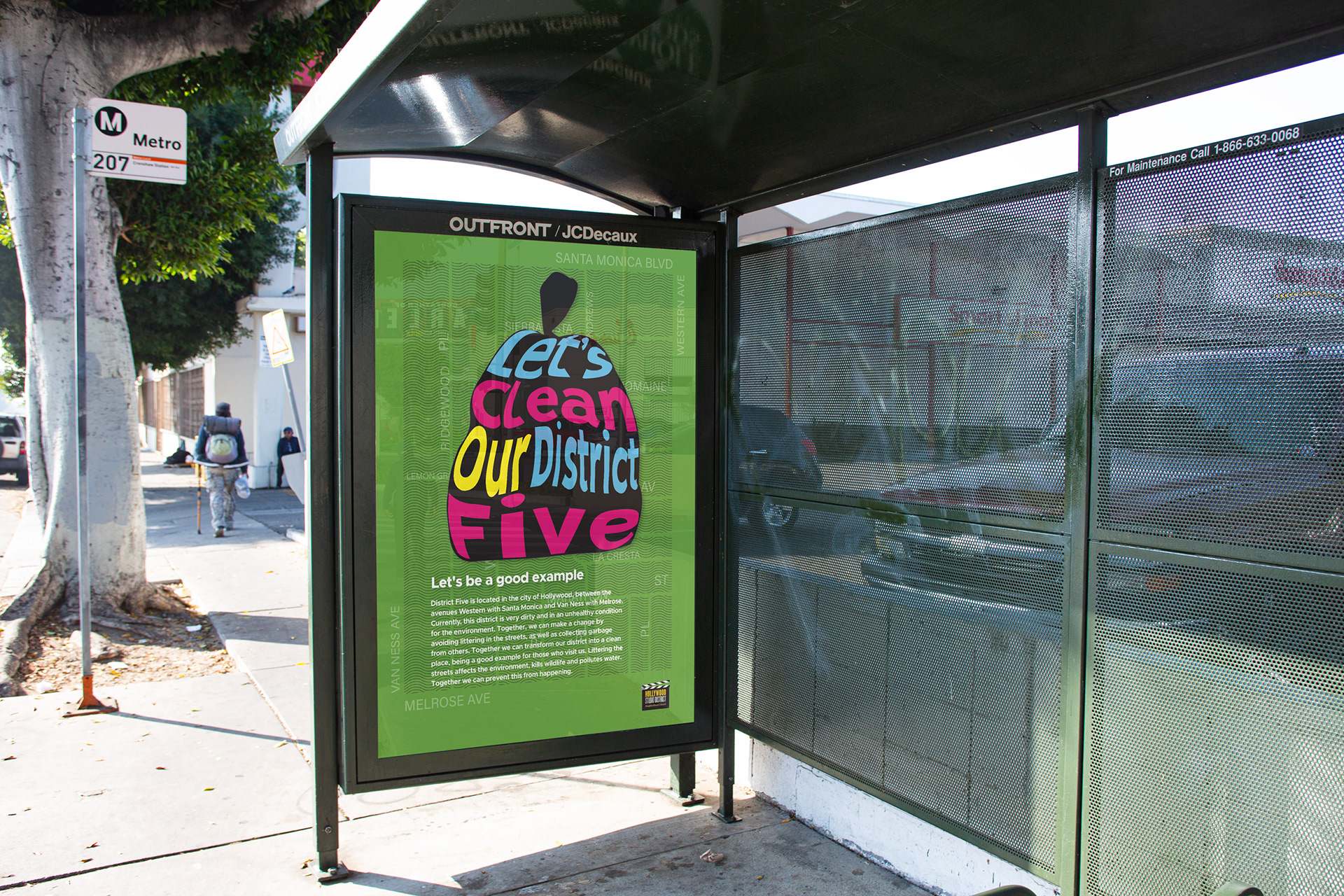 The imagery is based on the litter usually found in the area such as cans and cigarette butts, and also a trash bag which symbolizes the action of cleaning the streets in District Five. The colors are bright to draw the attention of the people walking by these posters. The Hollywood District logo was added to the bus shelter picture because these posters will be presented to the Neighborhood Council to make this project happen.