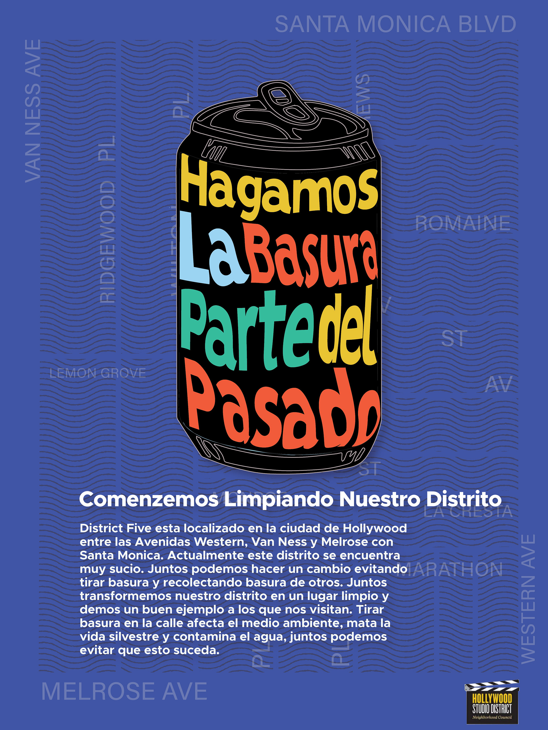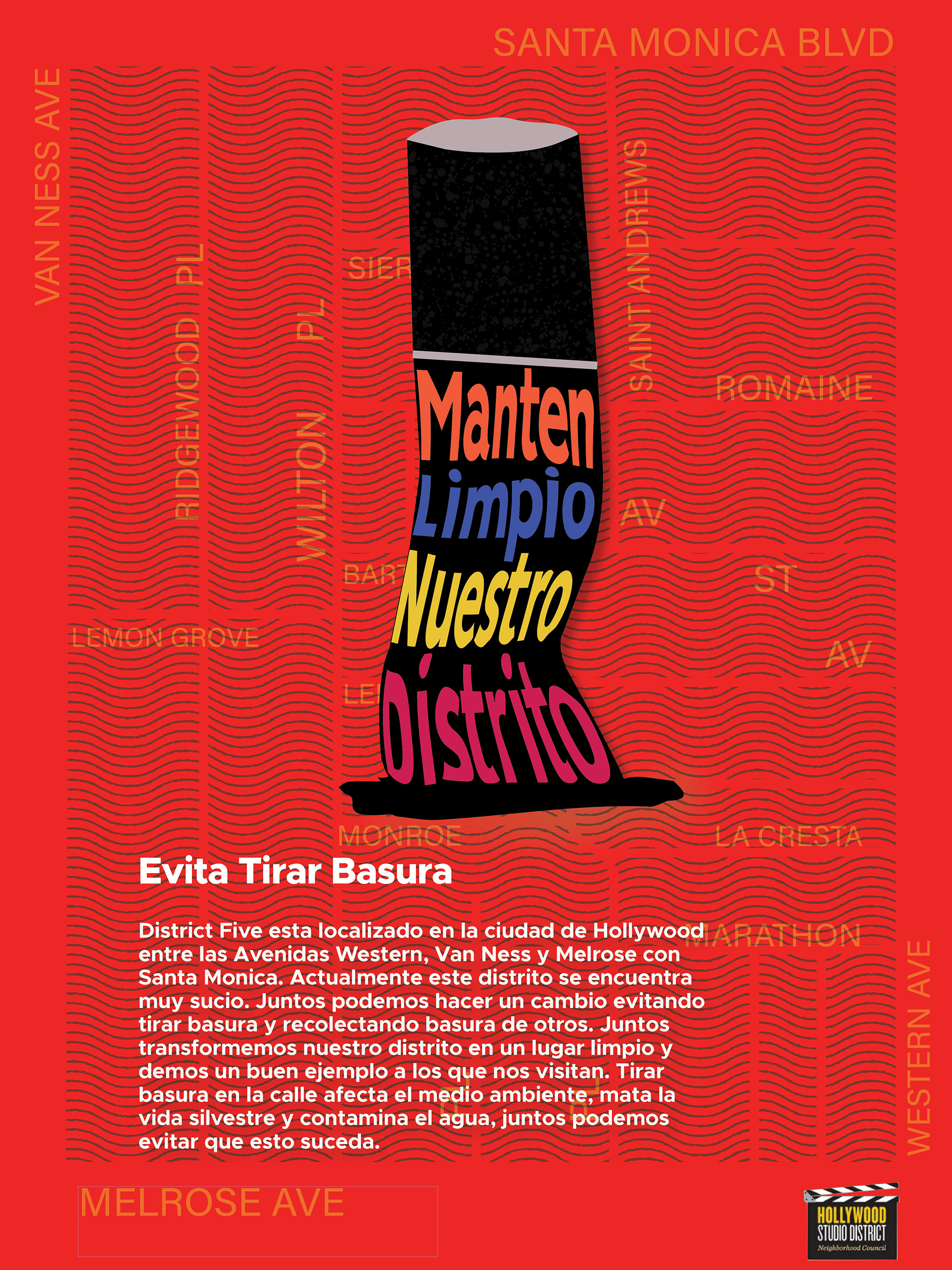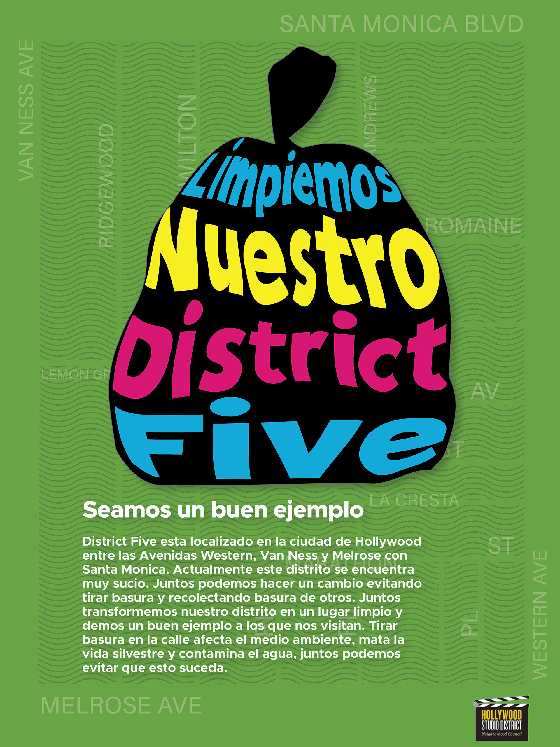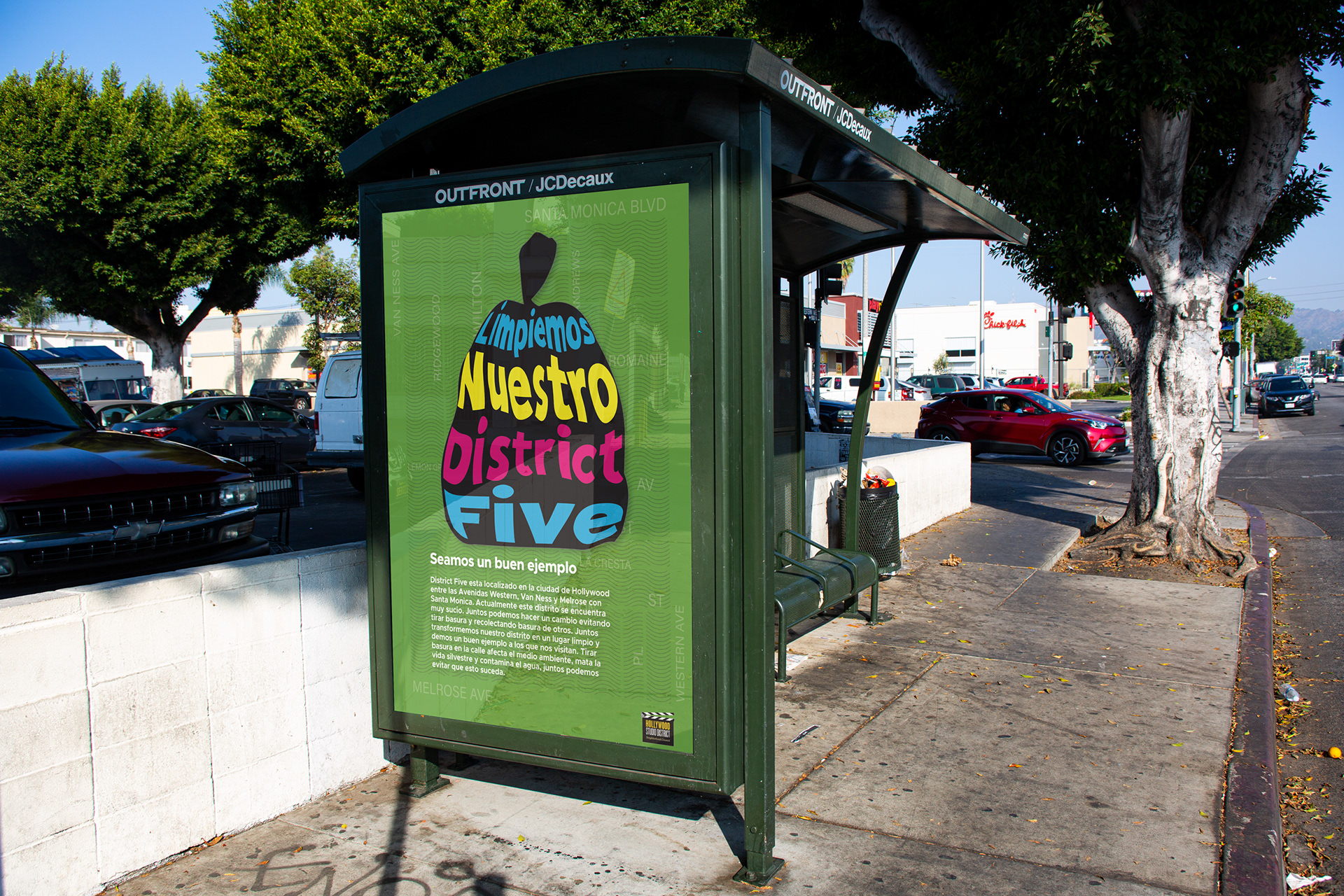 The imagery is based on the litter usually found in the area such as cans and cigarette butts, and also a trash bag which symbolizes the action of cleaning the streets in District Five. The colors are bright to draw the attention of the people walking by these posters. The Hollywood District logo was added to the bus shelter picture because these posters will be presented to the Neighborhood Council to make this project happen.